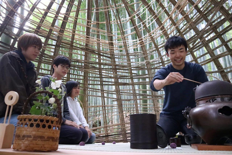 会場は、緑美しい竹林の中にたたずむ「玉ねぎ竹茶室」。京都建築専門学校(佐野春仁校長)の学生さんたちが伐採した竹で製作してくださったタマネギ型の茶室だ。竹で編んだ茶室の躙り口(にじりぐち)を入ると、2畳の広さの室内には琉球畳が敷かれ、掛け軸、シュウメイギクを生けた花入れがしつらえてある。竹の葉擦れの音を聞きながらゆったりとお点前拝見。このような自然の中でお薄を頂けるのも、ここ京都ならではのこと。この地に奉仕の縁を頂けたことに、改めて感謝の思いでいっぱいになった。