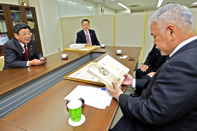 感謝状贈呈式を終え、「もちろん60周年にも参加しますよ。ちゃんと人数に入れておいてくださいね」と話す識名理事長に、佐藤町長は「その頃には復興がかなり形になっているはずです。楽しみにしてください」と応じていた。