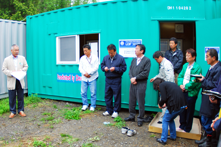 そんな縁もあり、南三陸町へは震災直後から多くのライオンズクラブが支援に入った。南三陸志津川ライオンズクラブは震災で会員1人を失い、残った33人のうち自宅と事業所の両方が全壊した会員31人、いずれかが全壊した会員2人と、全員が被災。そのため、復興支援活動の拠点として全日本のライオンズにより、仮事務所兼支援センターとしてコンテナハウスが設置された。6月2日には震災後初のクラブ例会がこのコンテナハウスで開催されたが、7月からの337-D地区(鹿児島・沖縄)ガバナー就任を前に被災地視察のため南三陸を訪問していた識名理事長がそれを傍聴。そこで、ゴングや万国旗などクラブ例会の備品全てが津波で流失したことを知り、その場で備品一式を手配。全沖縄ライオンズクラブの合同事業として南三陸志津川ライオンズクラブに寄贈した。