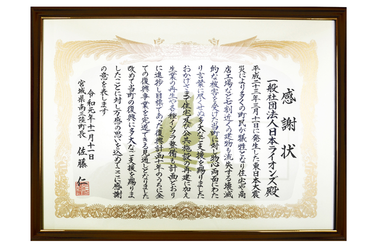 東日本大震災から8年8カ月を迎えた11月11日、震災で壊滅的な被害を受けた宮城県南三陸町の佐藤仁町長が、復興支援に協力した日本ライオンズへの感謝状を携えて東京・八重洲の日本ライオンズ事務所を訪れ、一般社団法人の識名安信理事長と石原英司副理事長に感謝状と記念品を手渡した。佐藤町長はこの6月から、復興御礼のため全国行脚をしており、今回の日本ライオンズへの感謝状贈呈もその一環。