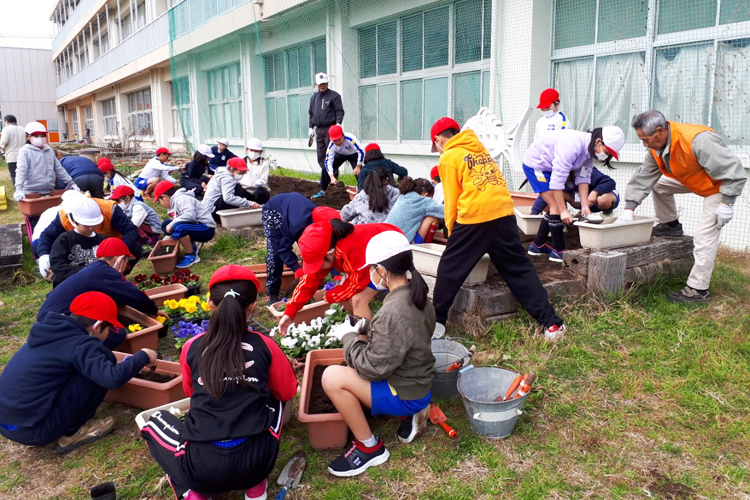 大東ライオンズクラブ(岩倉弟一会長/33人)は1月16日から24日にかけて、活動地域内にある五つの小学校で、児童と一緒にパンジーの苗の植え付けを行った。
