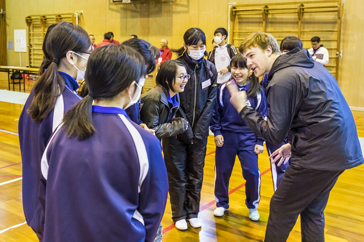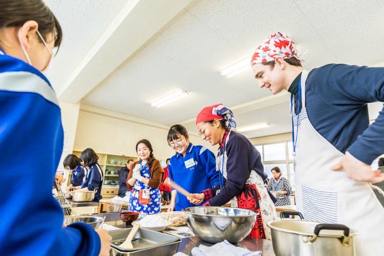 今回は広島と愛媛の中学校から生徒たちが70人ほど、ALTと先生が合わせて20人強集まった。生徒には四つのグループに分かれて、4科目の授業を1時間ずつ体験してもらう。科目は11月頃に打ち合わせをし、ALTの得意なものを募って決定する。例年、料理、音楽、スポーツに1科目加えるのが定番となっている。今年は4番目の科目としてスペイン語を選んだ。以前、開発途上国からのALTが参加した際は泥水をろ過して飲める状態にする体験を行ったこともある。