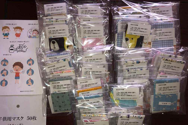 新型コロナウイルス感染防止のための自粛で、予定していた奉仕活動が中止になり、また例会も開催出来ない中、今何をすべきかとクラブの理事会メンバーで考えた。その結果、「仕事でマスクを買いに行けない子育て中のお母さんの支援が出来たらいいね」と意見がまとまり、会員全員に①縫製の出来る人②物品の提供の出来る人③この企画への寄付が出来る人を募った。そうして始めたこの活動、出来上がった300枚の一つひとつにマスクの取り扱い方と医療用不織布を入れ、更に三密を避けるよう書かれたシールを貼った。