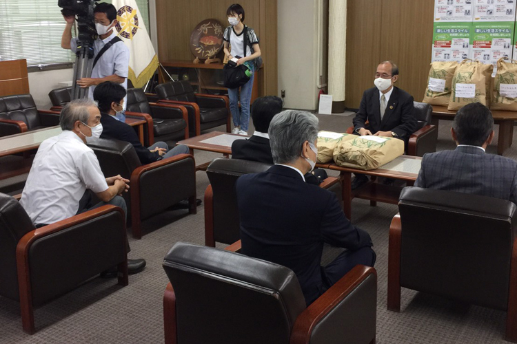 京都紫明ライオンズクラブ(48人)は6月18日、今年度最後の奉仕事業として、京都市内の子ども食堂へ配布して頂くために市にコシヒカリ350㎏を寄贈した。この米は、当クラブの故草木顕治元会長が所有していた市北部の山間地・京北町にある田んぼで、クラブ会員や地元住民が栽培したものだ。市が民間団体の運営する子ども食堂に希望を募ったところ、16カ所から10~30kgの要望があったという。この日、京都市役所で受納式を行い、門川大作市長に目録と米の一部を贈呈した。