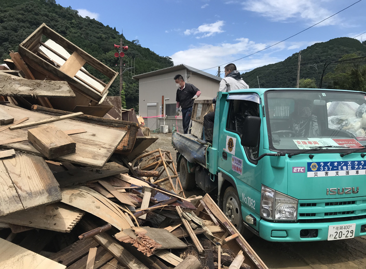 6日には337-E地区(熊本県)の髙野裕子地区ガバナーが被害の大きかった八代市と芦北市(人吉・球磨は高速道路不通で視察出来ず)を視察し、地区の支援活動が開始された。また同日、日本ライオンズ・アラートチームの青木和彦337複合地区班長が人吉入りして被害状況を確認。アドバイスを受けつつ、免田・錦ライオンズクラブ合同アラート委員会を立ち上げ、今後の対応を話し合った。