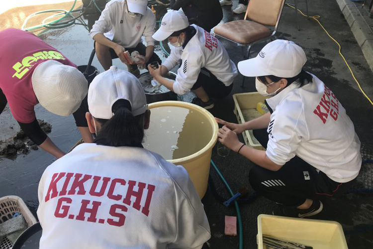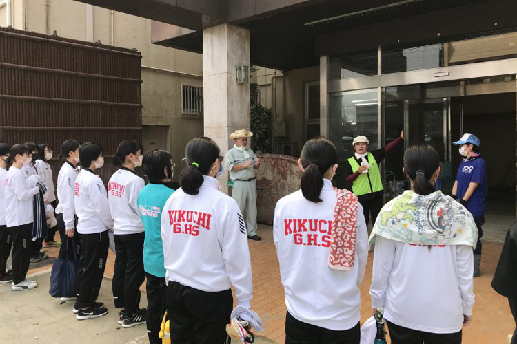 令和2年7月豪雨により、熊本県の人吉・球磨地方では多大な被害が発生した。菊池ライオンズクラブ(37人)がある菊池市は県北部に位置し、大雨は降ったが幸いにも被害の発生はなかった。当市には、菊池ライオンズクラブが結成・指導している菊池レオクラブ(津山実史会長/48人)があり、市内複数の学校の生徒らが共に活動している。それらのうちの一つ、菊池女子高校のレオクラブに参加している生徒たちは豪雨災害の発災後すぐ、荒木真紀子校長に「被災地、被災された方々のために何かしたい」と直訴。募金活動を始め、卒業生が寄贈してくれた体育館シューズ等を洗い消毒して被災地に送る活動を行った。