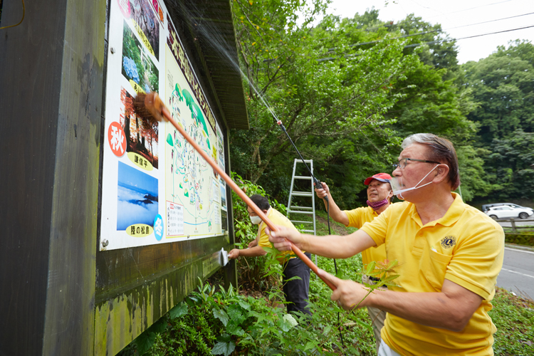 太平山の四季や見所を写真入りで紹介するハイキングマップは2015年に栃木ライオンズクラブが寄贈・設置したもの。あじさい坂周辺には、他にもクラブ結成50周年の記念モニュメントや参道入口に立つ木製看板など、ライオンズクラブが関わったものも多い。こうした寄贈物の周辺の除草や清掃も念入りに行われた。