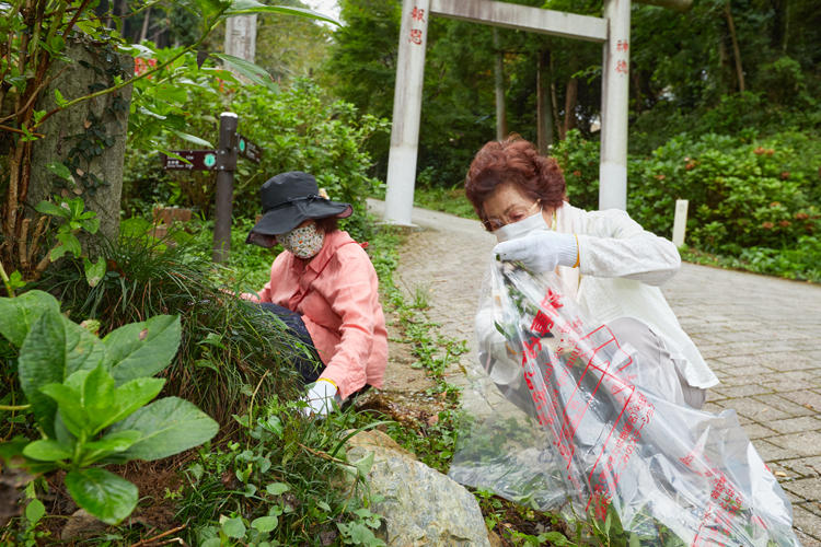 今年8月は猛暑続きだったが、当日は曇天。気温もそれほど上がらず絶好の作業日和となった。高齢のメンバーが多いということもあり、健康管理と短時間作業を心掛け、熱中症対策も万全で臨んだ。密を避けるよう作業は五つの班に分けられ、同時にスタートした。アジサイに追肥する肥料班とヤブガラシの除草班は2班ずつ、それぞれ参道の上下に分かれて進んだ。残る1班は、あじさい坂の入口付近に設置されているハイキングマップの汚れ落としを担当する清掃班だ。