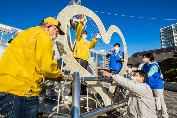そして6年目の2020年、川西池田駅前のイルミネーションもこの「手をつなぐ川西 光の和」の実行委員会が手掛けることになった。それまで川西池田駅前では他の市民団体がイルミネーションを実施していたが、昨年度の19年で終了。そこで実行委員会で引き継ぐことになったのだ。より市民に楽しんでもらおうと、川西市のゆるキャラ「きんたくん」の像も作成。駅前ロータリーの中心に据えた。