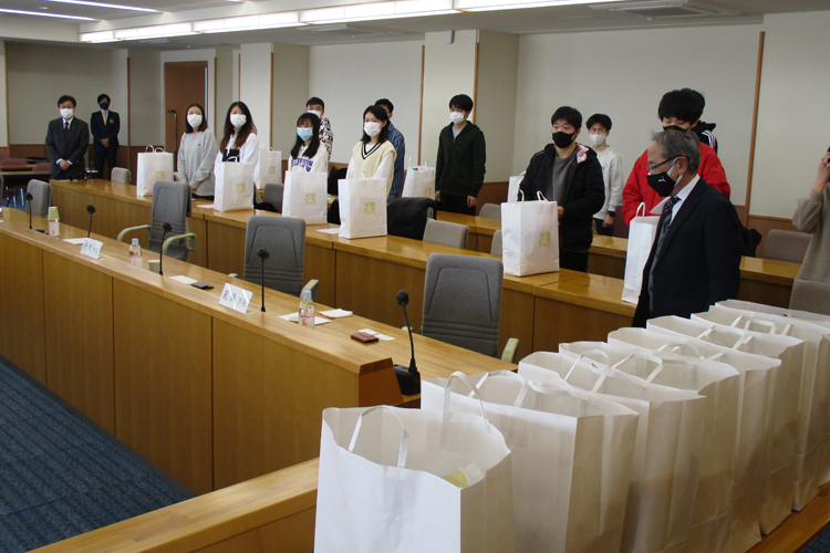 3月5日、札幌国際大学内で食料支援セレモニーを実施。当クラブから8人、学校側10人、清田区役所から2人、学生11人が参加し、ソーシャルディスタンスを保ちながら進められた。まず石田会長から学生たちに、「コロナ禍で大変な中、学生生活の少しの足しにしていただきたい」と、クラブ・メンバーの思いを伝えた。大学長からは感謝の言葉と感謝状を頂いた。学生の代表からは、「大変うれしいです。これからもがんばります」との言葉をもらった。