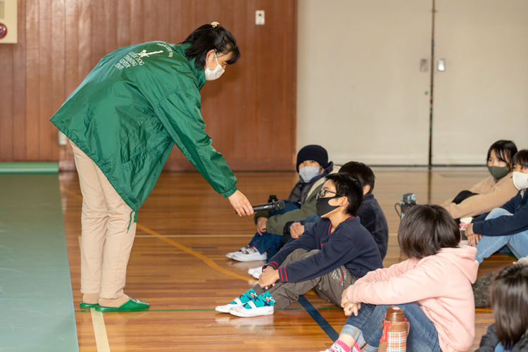 曙川小学校の出前授業ではまず、視覚障害とは何かを子どもたちに考えてもらう。「まぶしすぎて見えない」「一部が見えない」など視覚障害にもさまざまな種類があることを伝えた。その後、先生が一部しか見えないゴーグルを着けて歩行体験。おっかなびっくり歩く先生の姿を、子どもたちは驚きの表情で見つめていた。白杖の使い方も動きを実演。視力を完全に失っていない人も白杖を持っているケースが多いことなどの説明に真剣に耳を傾けていた。