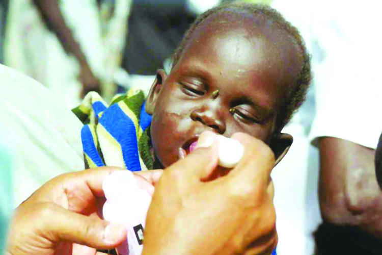 トラコーマ予防のために経口薬を投与される赤ん坊