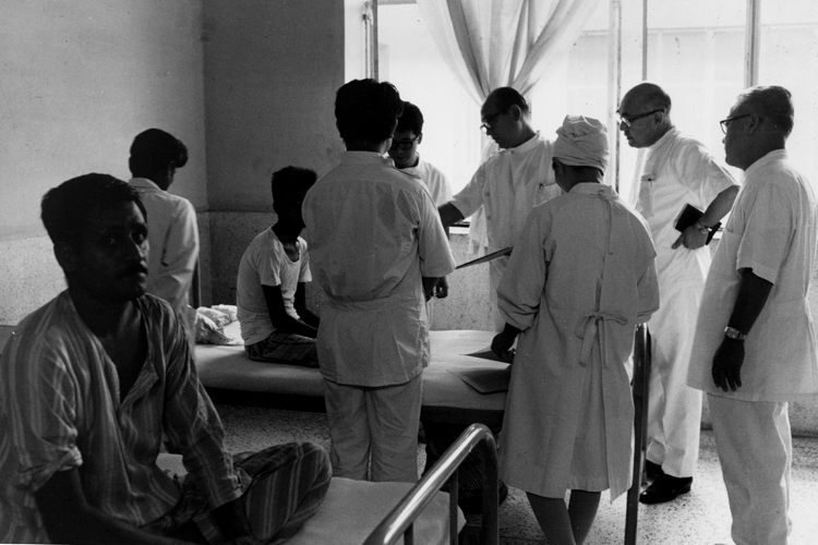 インド救ライ事業を産む一粒の種となったのが、ハンセン病専門医の宮崎松記博士だ。彼は1958年、熊本県にあるハンセン病療養施設菊池恵楓園の園長を59歳で退官し、残りの人生をインドのハンセン病患者のために費やしたいと強く願っていた。博士の思いがライオンズとつながるのは1959年。宮崎博士の親友の医師が、医師会会議に出席するために上京。滞在したホテルのレストランで、後輩である同ホテル常務の豊田治助(東京ライオンズクラブ会員)と朝食を共にし、宮崎博士のハンセン病治療への情熱について語った。豊田は強く引かれ「何とか博士の夢を実現したい」と考えていたところ、偶然にも同じホテルに日本ライオンズ草創期からの中心人物である医師の原勝巳(岡山ライオンズクラブ会員)と、当時の駐インド大使が居合わせた。4人の話し合いにより、たった一人の医師の夢が一気に現実味を帯びる。大使は既に別の人から宮崎博士について聞き及んでいて、「日本政府からの派遣よりも、政治色の無い民間の奉仕団体による活動の方がインド政府は受け入れやすいだろう」という考えがあった。まさにライオンズの出番だった。その年の5月に開かれた日本ライオンズの年次大会で、宮崎博士への支援が緊急討議された。この日全国の122クラブから集結した3,000人のメンバーは、インドのハンセン病事情調査のために博士を派遣することを割れんばかりの拍手をもって決定。たちどころに62万円の募金が集まった。都市銀行の大卒初任給が15,000円の時代だ。彼らの武者震いをするような使命感が伝わってくる。