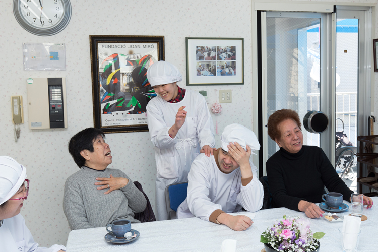 午前10時半、工房脇の坂道から2階にある喫茶室へと通じる入り口を通って、一人、また一人といつものお客さんがやってきた。この日は月に2日オープンするカフェの営業日。カフェでは利用者がサービスを担当し、クッキー2個とコーヒーのセットを100円で提供している。毎回、ご近所の常連さん5、6人が集まって、1時間ほどおしゃべりを楽しんでいく。工房の休憩時間になると、クッキー作りや梱包の作業をしていた他の利用者たちも喫茶室に集まってきて、おばあちゃん世代のおしゃべりの輪に加わった。常連さんたちは普段から、施設まで徒歩で通ってくる利用者とあいさつを交わし、温かく見守ってくれている。