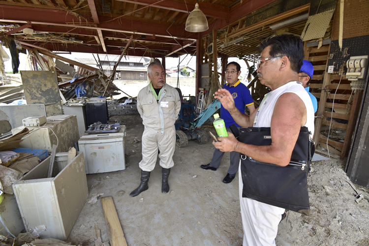 識名議長と藤川議長がまず訪問したのは、倉敷真備ライオンズクラブに所属する小野宗次336-B地区第1副地区ガバナーだった。小野副地区ガバナーの自宅兼事業所は真備町の有井地区にあり、隣には同じクラブの会員・諏訪光弘氏宅の敷地内に建つ倉敷真備ライオンズクラブの事務局がある。ここは末政川の堤防決壊現場から近く、しかも越流水の通り道に当たってしまい、真備の中でも特にひどい被害となってしまった。決壊現場は14日の時点でも修復が終わっておらず、議長2人が訪問した時は川からあふれ出す水で周辺が冠水、クラブ事務局もまだ水没していた。
