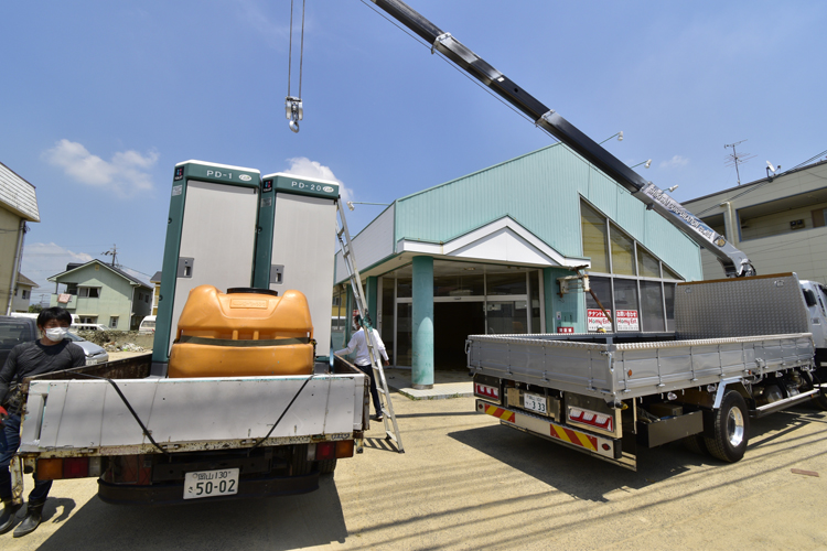 この5リジョン対策本部の近くには、岡山ライオンズクラブと岡山みらいライオンズクラブが、被災地支援活動の拠点としてプレハブの事務所を設置。仮設トイレ4基を配備すると共に、支援物資の集積所として使い、主に在宅被災者への支援に絞り、活動を展開していくことを決めている。2人の議長はこちらも表敬訪問、汚泥の除去などの手伝いも行った。