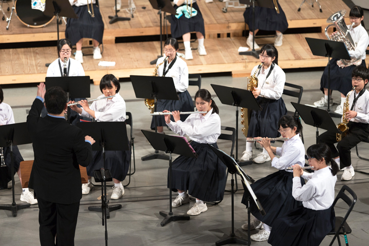 翌日はいよいよ本番。岐阜市民会館のエントランスに「第13回中学生吹奏楽フェスティバル&ふれあいコンサート」の看板が掲げられた。午前中のリハーサルの後、13時からの第1部は市内4校の吹奏楽部の生徒たちが3曲ずつ披露する「中学生吹奏楽フェスティバル」。そして第2部は、前日に中学生に技術指導を行った中部航空音楽隊の皆さんによる演奏。あの「長良川ふれあいコンサート」の流れをくむ演奏会だ。ふれあいコンサートの最後は、中学生と音楽隊の合同演奏となる。曲は、高校野球などスポーツの応援楽曲でもおなじみの「アフリカン・シンフォニー」。音楽隊と一緒に演奏すると自分の音まで変わった気がするという生徒も多く、かけがえのない貴重な体験となる。また、中学生たちは7月の終わりにコンクールを控えているが、その前に大きなホールでの演奏を体験出来る点でもこのフェスティバルは大事な機会である。