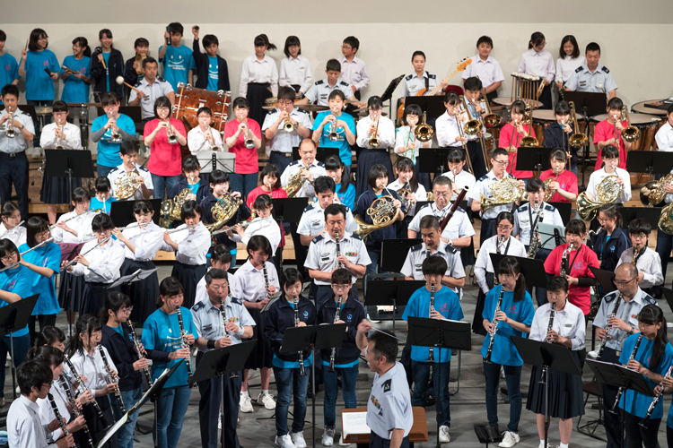 クリニックの所要時間は2時間弱と短いが、現役で活躍する奏者に基礎的なことから表現方法まで幅広く指導してもらえるため、生徒たちからも評判が良い。それまでは学校の先生やプロの楽団員が、一度に全部員に教えるスタイルだったが、自衛隊の担当になった昨年からは楽器パートごとに指導してもらえるようになり、より密度の濃い指導が実現している。教える側も、教えられる側も、この日が初対面。クリニックはお互い緊張の面持ちで始まるが、終わる頃にはすっかり打ち解けるようだ。指導してくれた隊員と記念撮影をする中学生たちの姿が印象的だった。