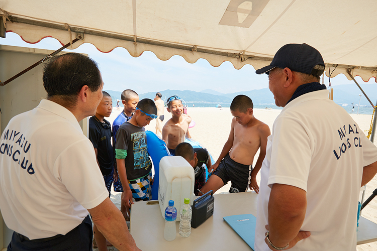 最高気温35度を超えたこの日、詰所には「貸しパラソルはどこ?」「空気入れはない?」といった問い合わせが数件あった他に、宮津ライオンズクラブ主催の野球大会に昨年出場した中学生野球部のグループが立ち寄ったぐらいで、平穏無事にパトロールを終えた。入会以来、長年この海浜パトロールを続けてきた多賀会長は、これまで深刻な事故に遭遇したことはなかったと話すが、過去にはけがで出血した海水浴客のために救急車を呼んだケースもあったという。