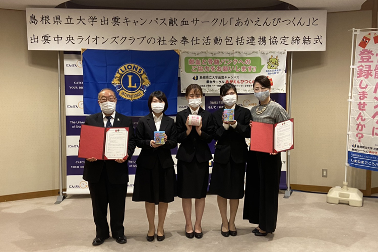 6月23日、出雲中央ライオンズクラブ(藤原靖司会長/56人)は島根県立大学出雲キャンパスの献血サークル「あかえんぴつくん」と、献血活動を主とした社会奉仕活動包括連携協定を結んだ。当日はクラブを代表して6人、大学からは学生生活部長、顧問、サークルの学生など10人が出席し、調印式が執り行われた。