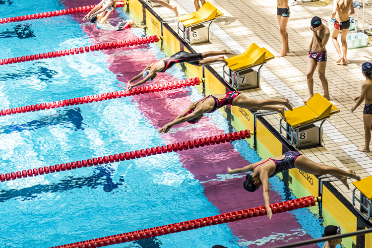 子どもたちに喜ばれる理由は、スイミングクラブに所属する小学校1年生から中学校3年生までの子どもであれば、誰でもエントリーが出来るから。気軽に出られる大会であるにもかかわらず、会場は1994年にアジア競技大会のメイン会場となった本格的な50mプール。しかも水泳連盟の記録員が正式にタイムを計測するので、結果は公式記録として認められる。