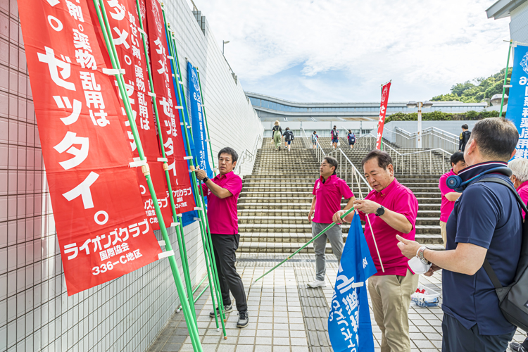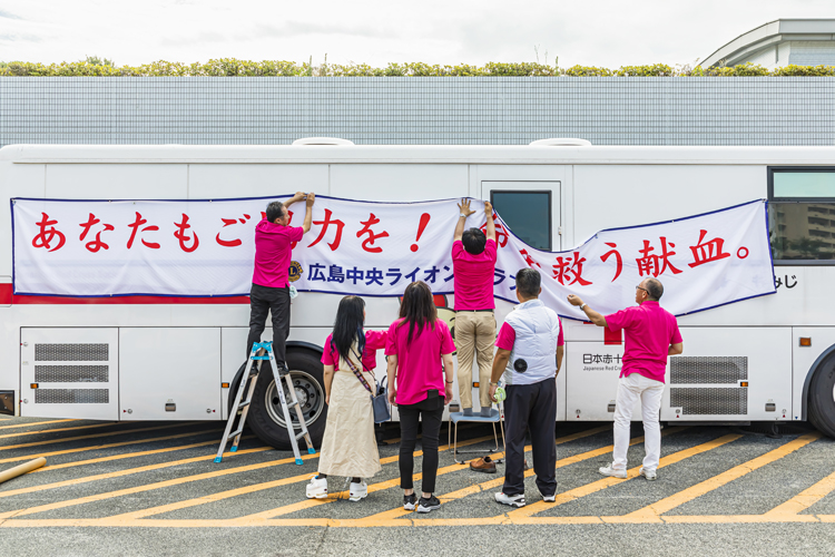広島では7月半ばから猛暑日が続き、大会が開かれた7月30日も日中の気温は35度を超えた。屋外ではしきりに汗をふく人や日傘を差して歩く人の姿が目立つ中、クラブは例年通り大会会場の駐車場に献血車を配置し、メンバーが献血の呼びかけも行った。